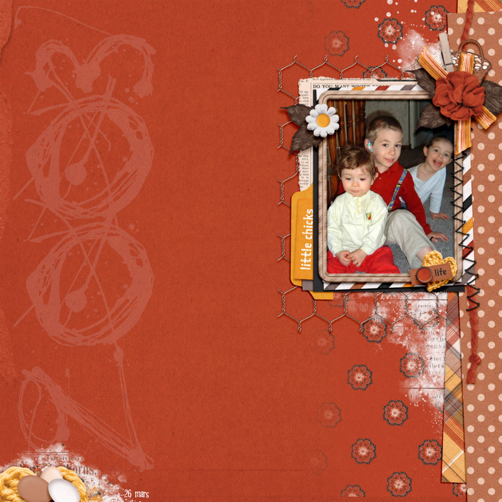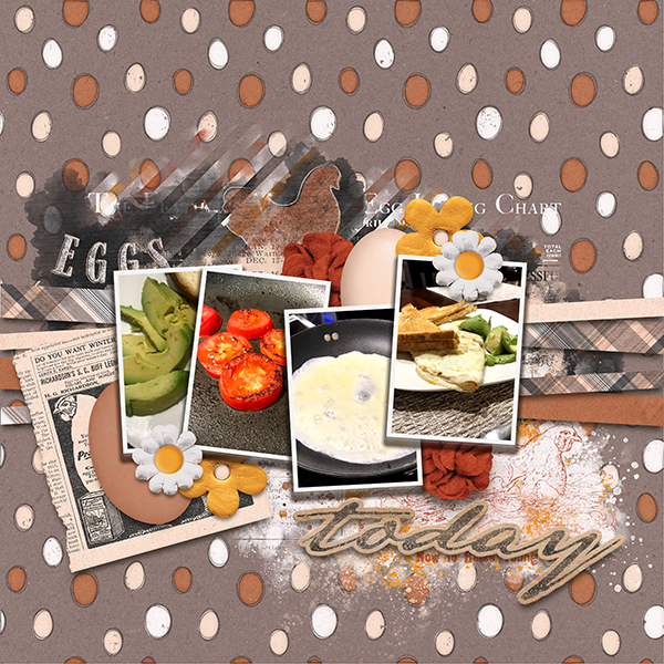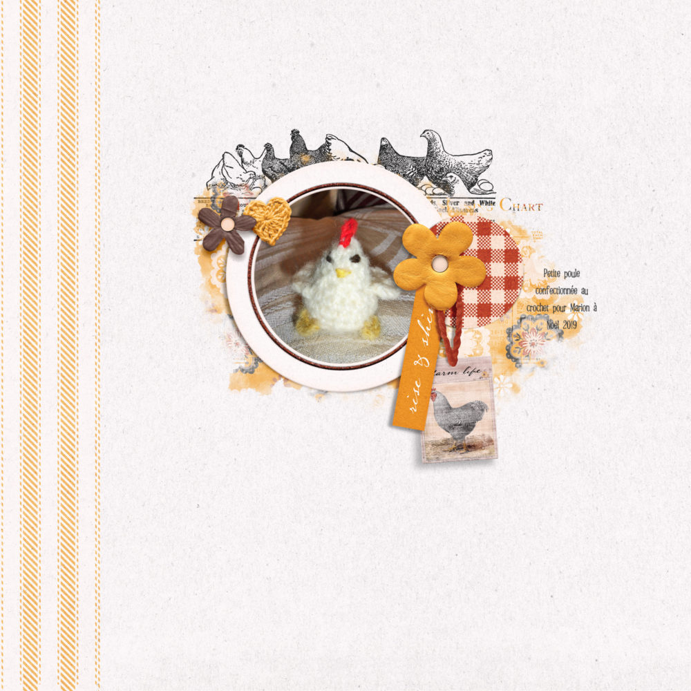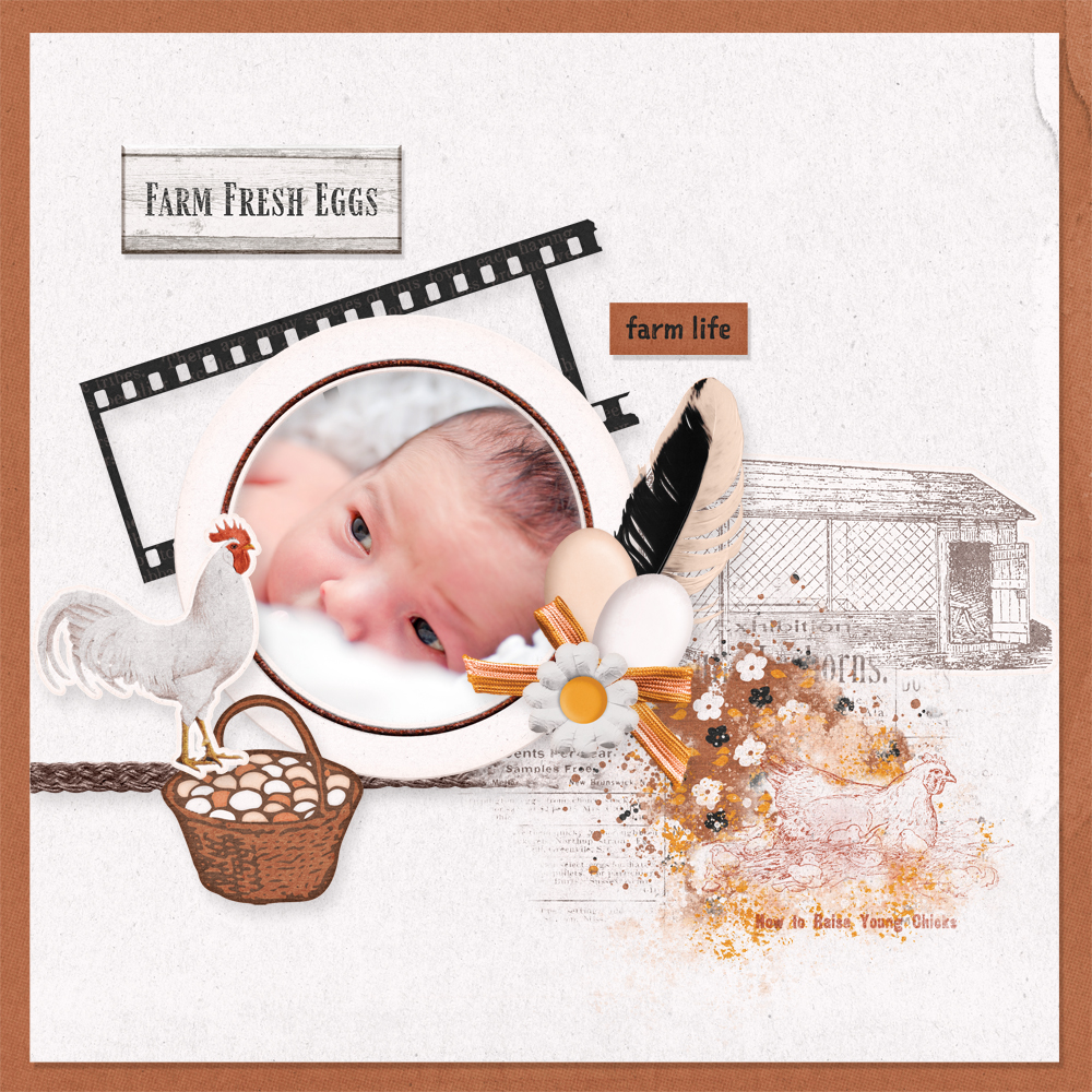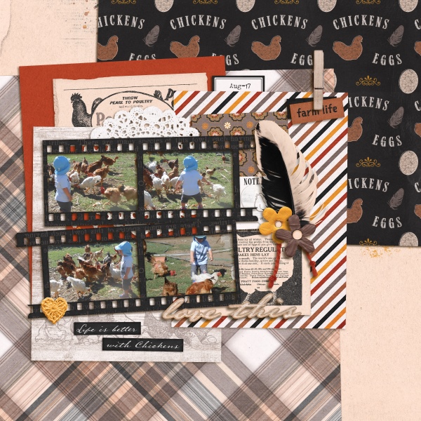 I decided to post a tutorial for the text I used in the kit. You can see examples of it on the Chickens journal card and in some of the papers from the Chicken Keeper bundle. I used Photoshop and these are the materials I used in creating this effect.