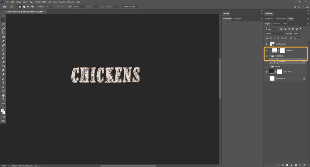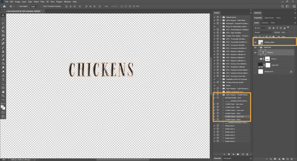 Be sure the text file is selected, not the group, and now click on the Doodle Actions : 3 sketch layers – Less Wavy. Push the play button below to run the action. In it you will choose a color. For my case I used a dark cream color. Once it is finished it will create a smart object layer called “doodle_outline”. Note: If you double click on this new layer you can always change the color by filling or clipping a solid color.