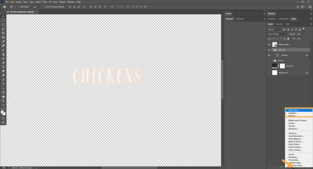 Now to apply a color to your text you will need to find the half filled circle at the bottom of the panel. Once you click on it, select from the menu Solid Color & choose your color. In my case I chose a white.
