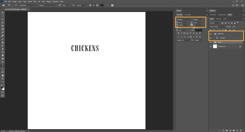 First in a new document create your text. As a note you can use shapes, illustrations, images, ect as well. Create a group and place your text in it. I used the font Farmhand and gave the letters some space.