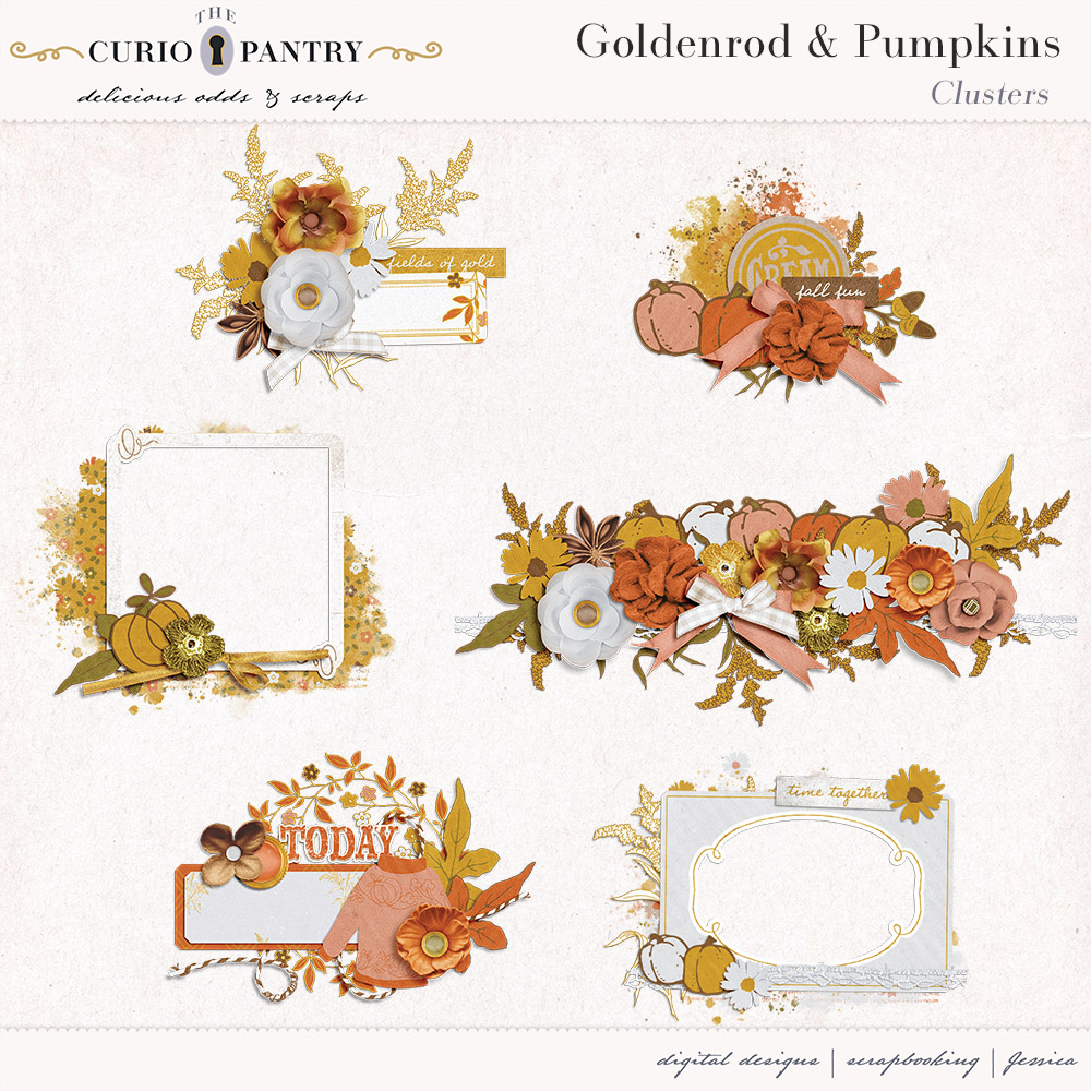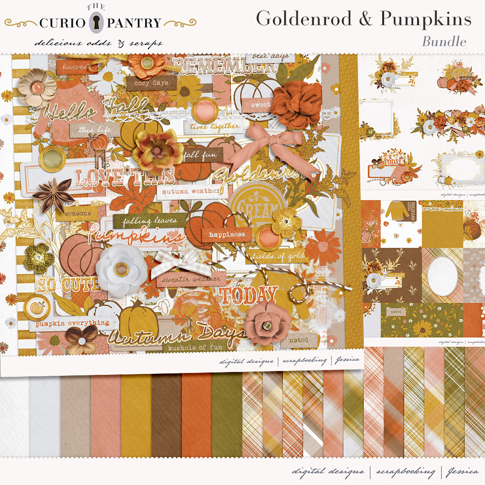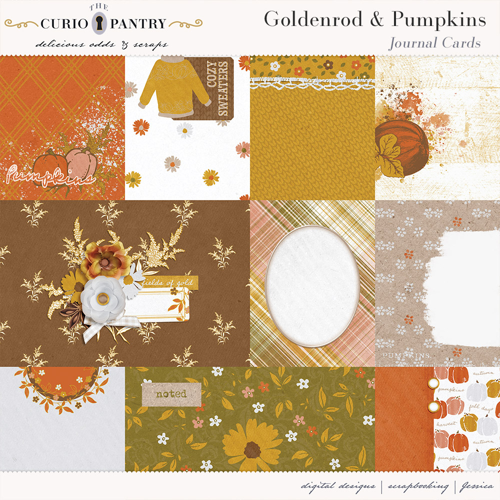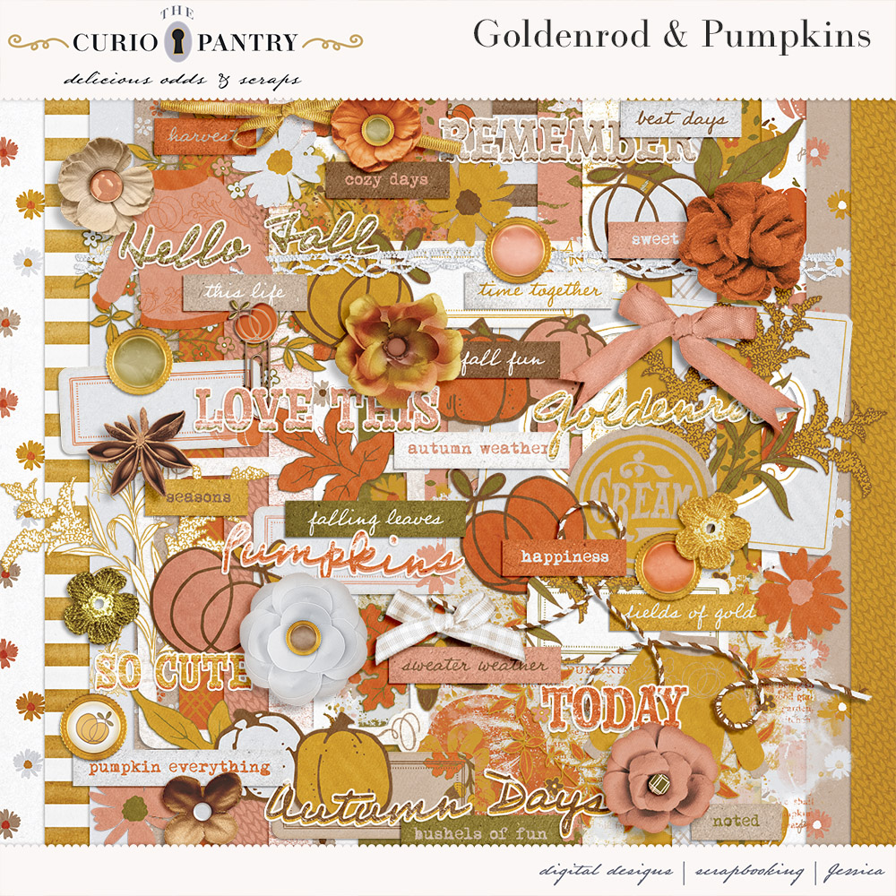 Goldenrod & Pumpkins evoke the slower pace of September days signaling the arrival of autumn. The weather turns cooler, sweaters are unpacked and the colors of fall begin to take shape. There are 6 clusters, 10 journal cards in three sizes, over 70 unique elements, and over 40 papers.