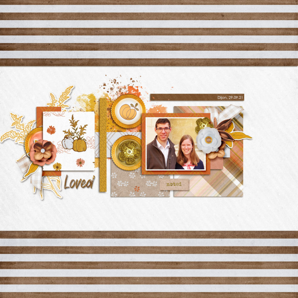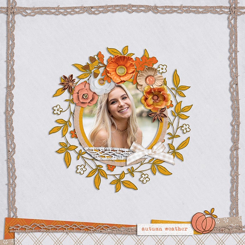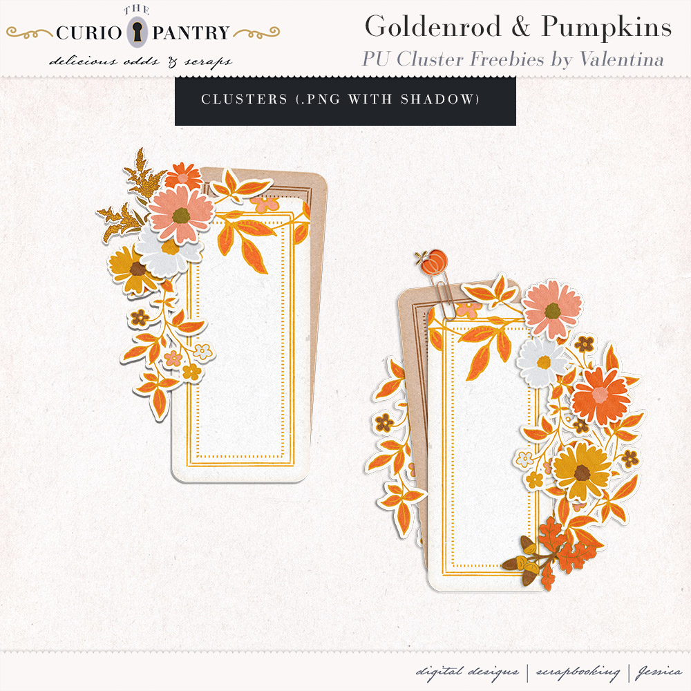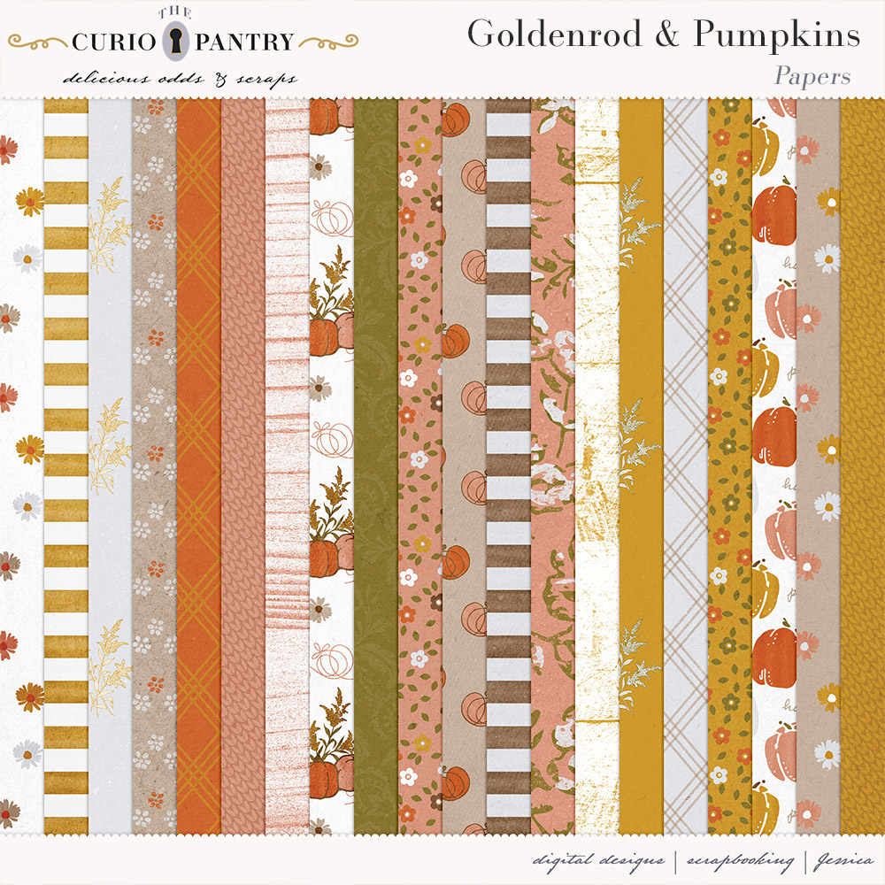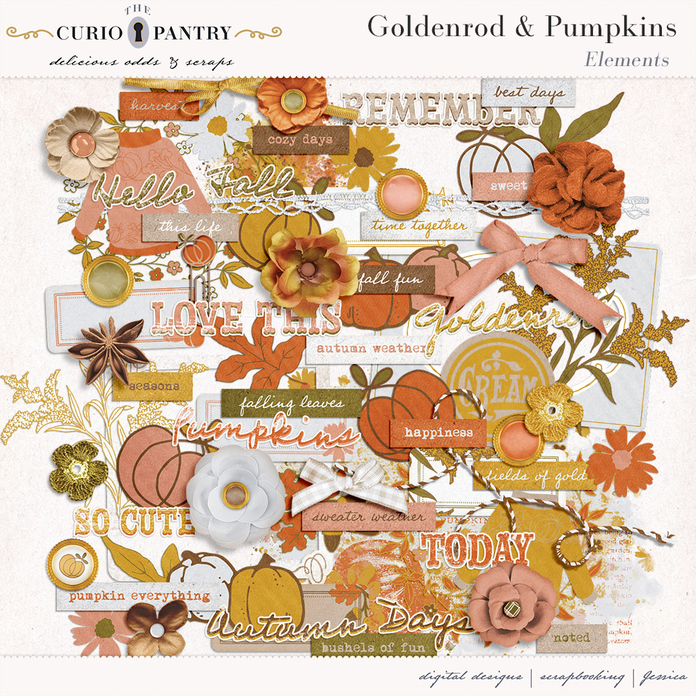Goldenrod & Pumpkins evoke the slower pace of September days signaling the arrival of autumn. The weather turns cooler, sweaters are unpacked and the colors of fall begin to take shape. There are 6 clusters, 10 journal cards in three sizes, over 70 unique elements, and over 40 papers.