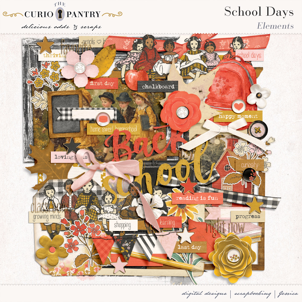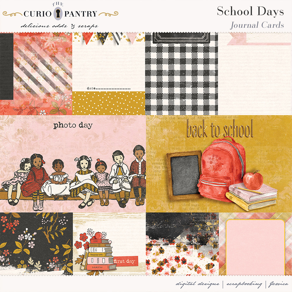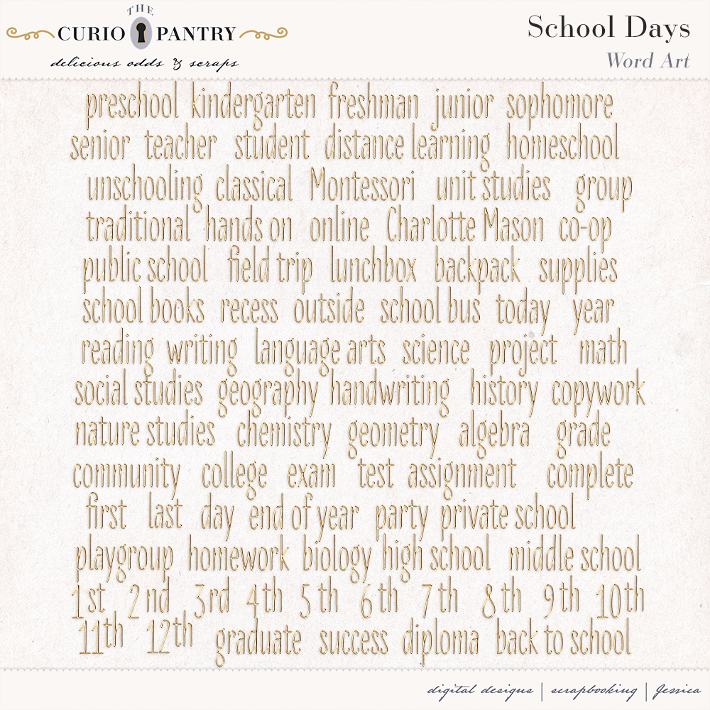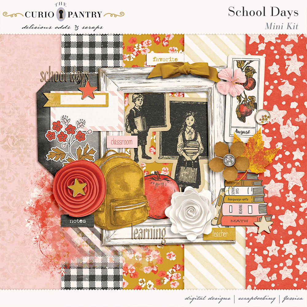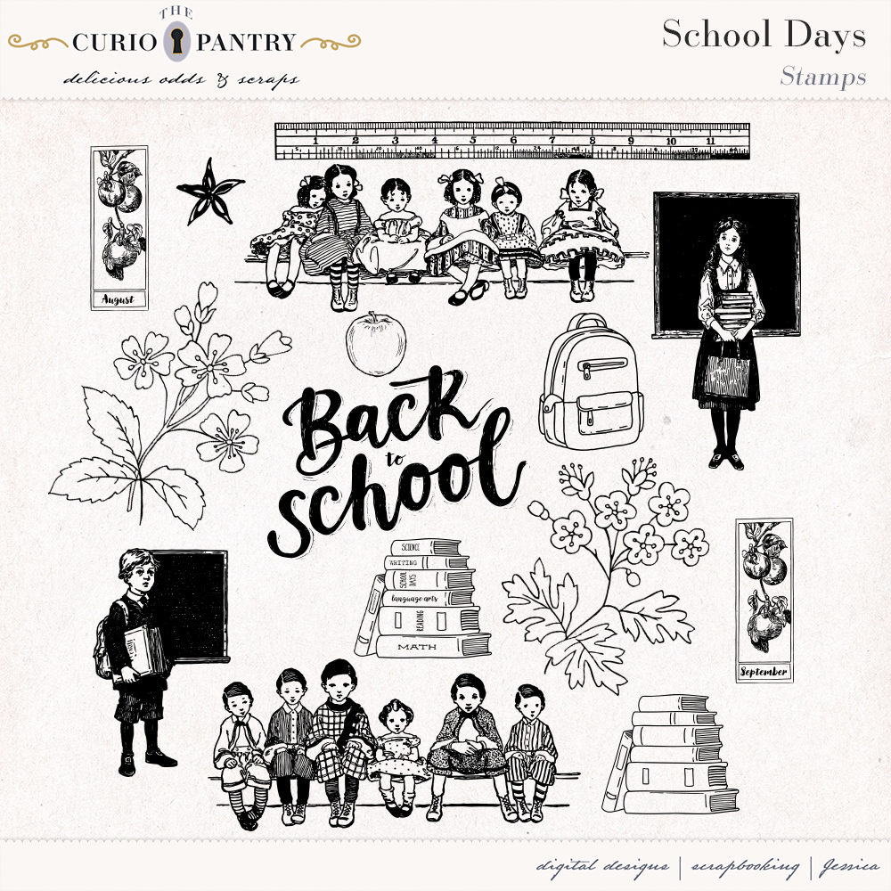 August and September are the typical months of children heading back to the classroom. This School Days bundle has a wide range of elements, word art, journal cards, stamps, and papers to help you document your own school days or those younger ones in our lives. It’s nostalgic feel is perfect for documenting the past or present!
