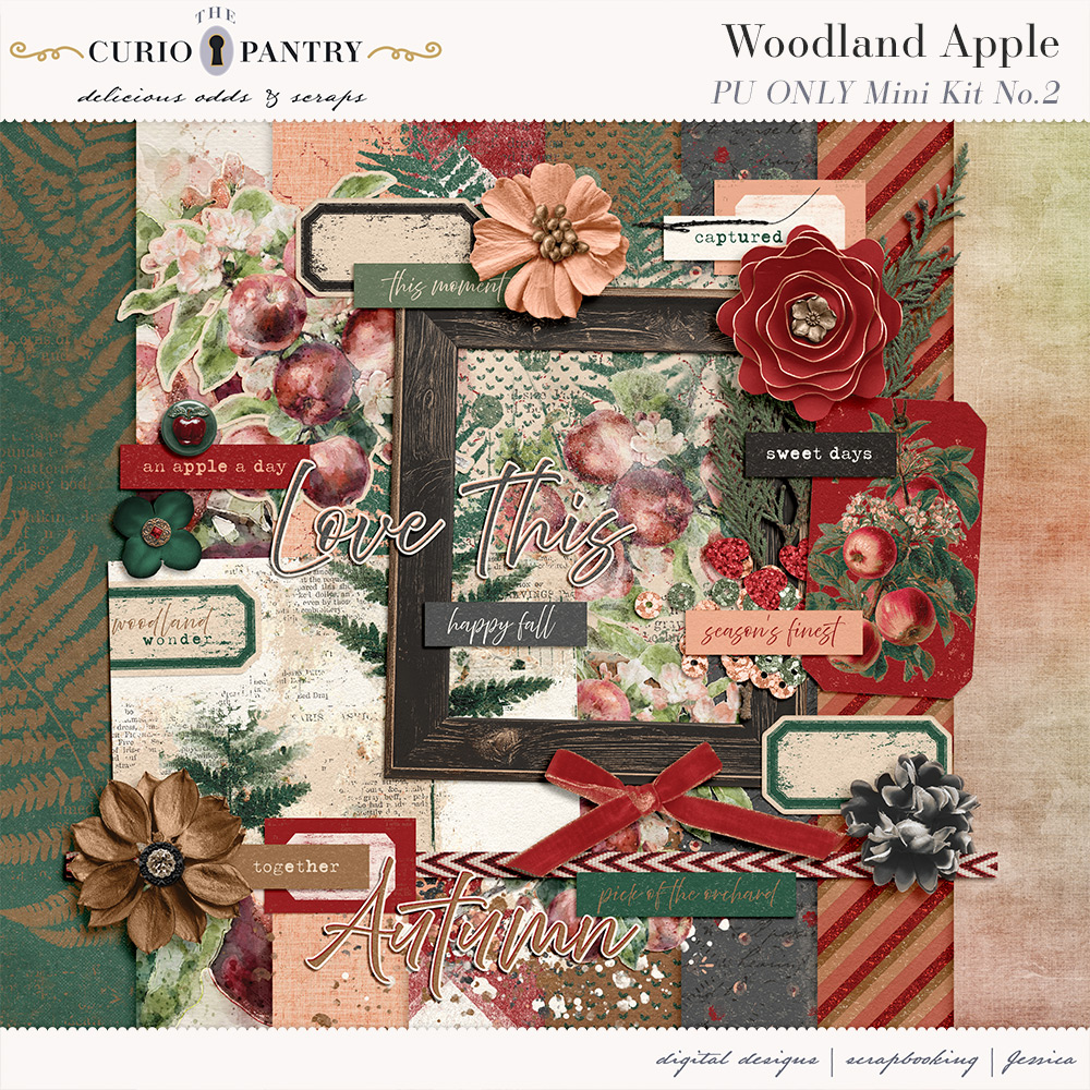 Woodland Apple was inspired by the fragrant apple trees that provide so wonderfully those morsels of sweetness. With a rustic palette from nature you can embrace the season with 31 elements, 1 journal card in three sizes, and 21 papers for you to use in your projects.
