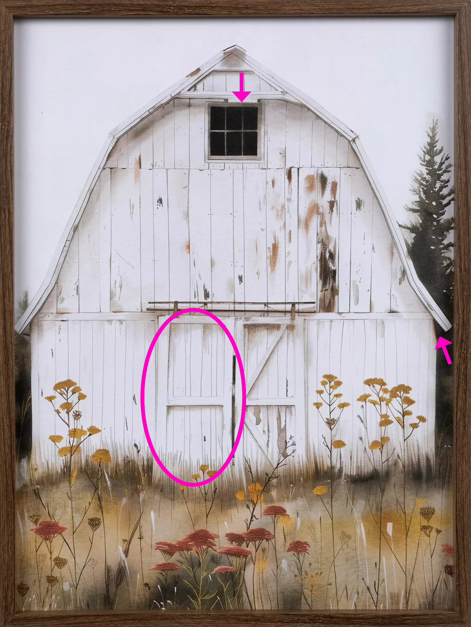 Here is a good case for the lack of symmetry I spoke about. When you look at a barn in the real world, you will almost always, see both sides of a barn door to be built the same. AI tends to create one side with one kind of building technique and the other side without, as is shown here. Also, a couple of other clues are the strange shape of the building under the eave on the right, as well as the odd break in shadowing above the window.