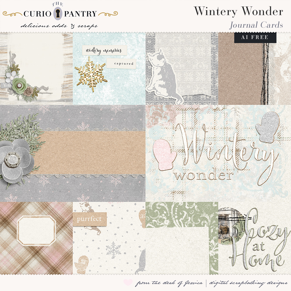 Winter brings with it the deepest cold, but also the prettiest snow and icescapes. So, though, we may have to reside indoors for a short time, we can delight in the cozy warmth we create within our homes. Cats seem especially good at showing us how to be cozy too. This bundle, Wintery Wonder, embraces the cold wintery months and the space we carve out in our homes to help us move thru the season – but in a delightful tone despite the gray and gloom the season may bring. This bundle is perfect for presenting our cozy wintery moments in our projects and pages and to appreciate all that each season has to offer.