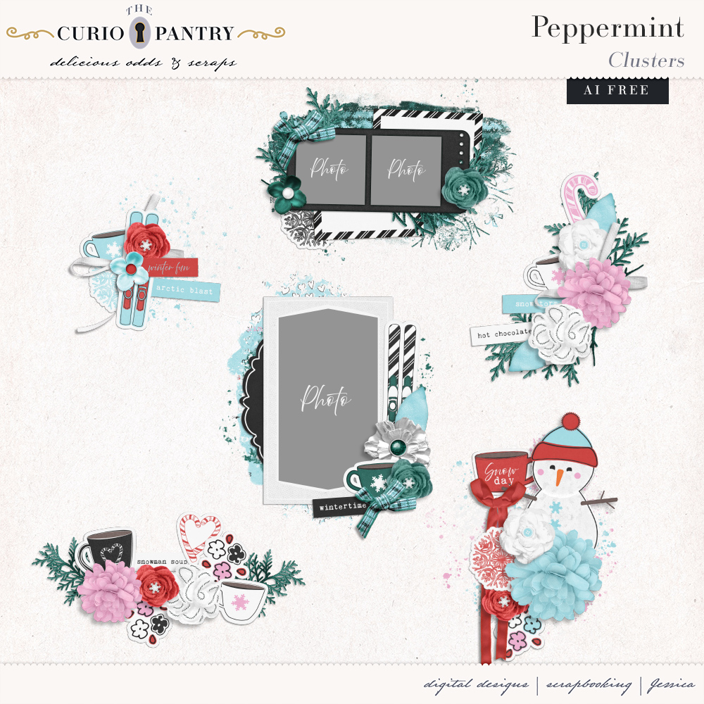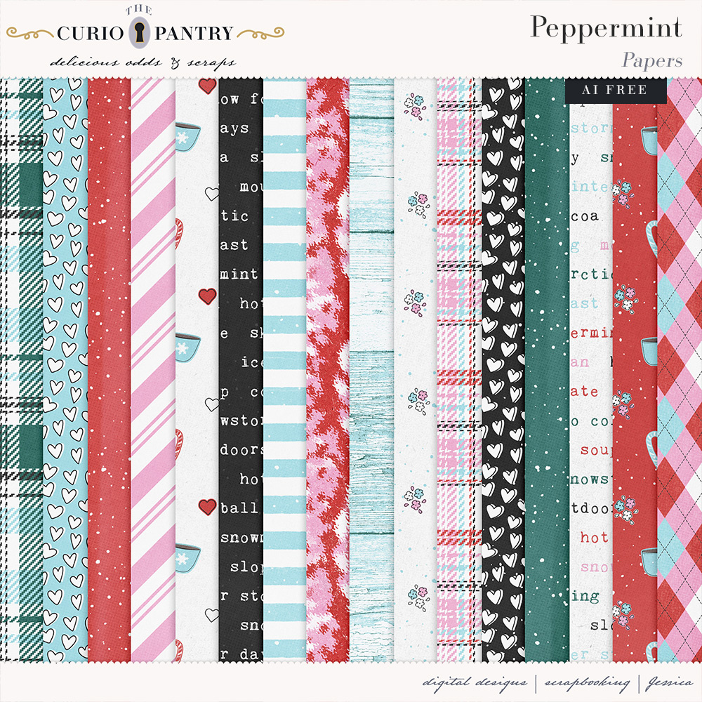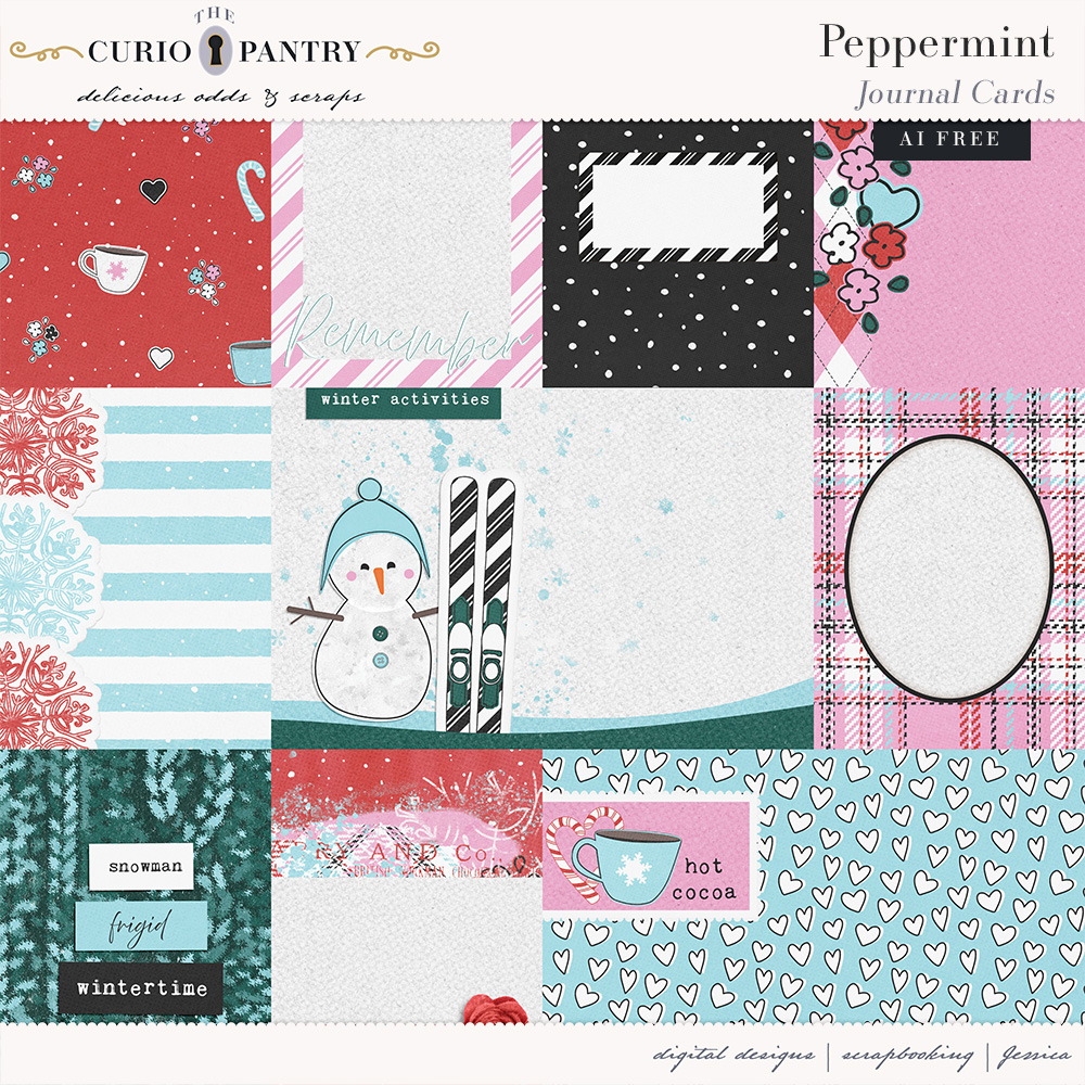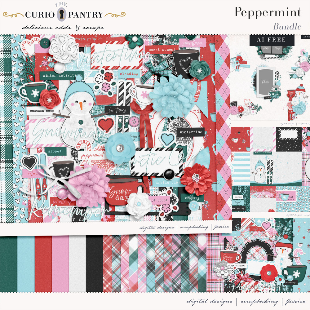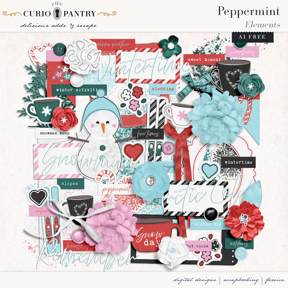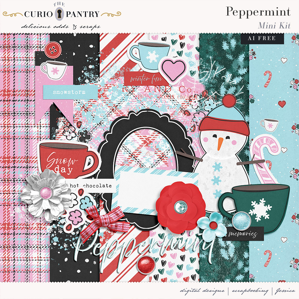 We are wrapping up another another Winter storm here. There is 3 inches of snow on the ground that has been more like a giant ice rink since Winter Storm Fern. These are the days to stay bundled up, eat hot soups (cheeseburger soup anyone?), and make Snowman Soup! For those who don’t know Snowman Soup is hot chocolate, a candy cane or other peppermint, marshmallows, and a little bit of a chocolate bar. It is oh so yummy and what inspired an entire new bundle – Peppermint! So without further ado you can find my free mini for this month’s Digital Scrapbook Blog Train below. There is also a coordinating bundle available at Digital Scrapbook. Happy Scrapping!