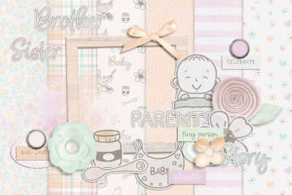 Whether it’s memory lane of your own babyhood or you are a new Aunt, Uncle, cousin, parent, or grandparent you can celebrate the arrival of a new baby or grandbaby with this soft and sweet “Baby Dear” scrapbooking bundle. The soft colors and lots of cute elements of this bundle make a charming addition for your projects and documenting your memories.